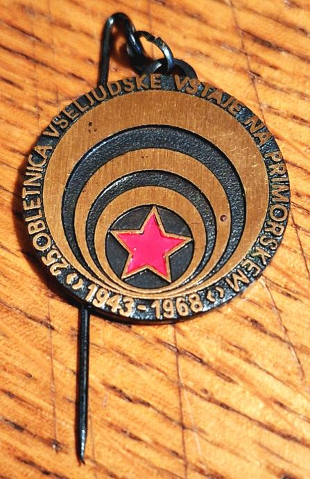 Prodam oštevilčeno spominsko značko 25. obletnica vseljudske vstaje na Primorskem 1943-1968, ki je bila podeljena udeležencu NOV na proslavi v Novi Gorici dne 15.9.1968.
