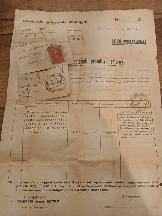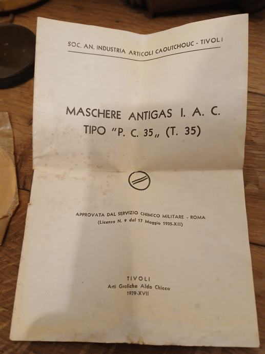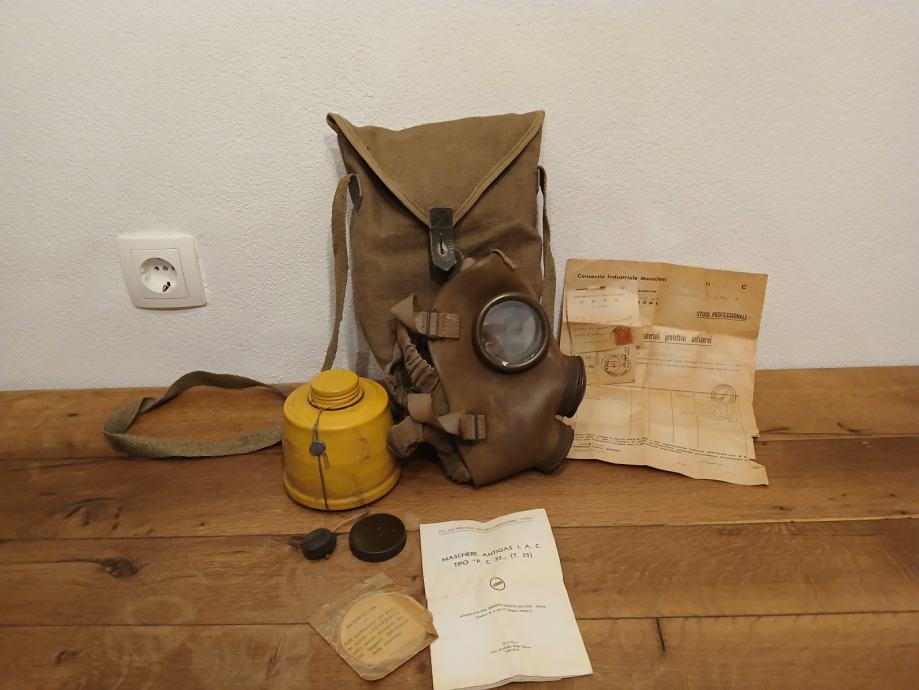 Prodam nikoli rabljeno italjansko civilno plinsko masko PC 35 z vsemi pripomočki. Filter je še zaplombiran, kar je zelo redko. Zraven pride tudi priročnik za uporabo, rezervne leče, rezervni ustnik in original prejemnica skupaj z računom iz leta 1939. Tudi torbica je kot nova. Prevzem možen v LJ.