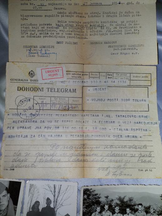 Cena za lot JNA fotografi vojakov , en vojna pošta in dohodni telegram vojna pošta Tolmin letnik 1958.