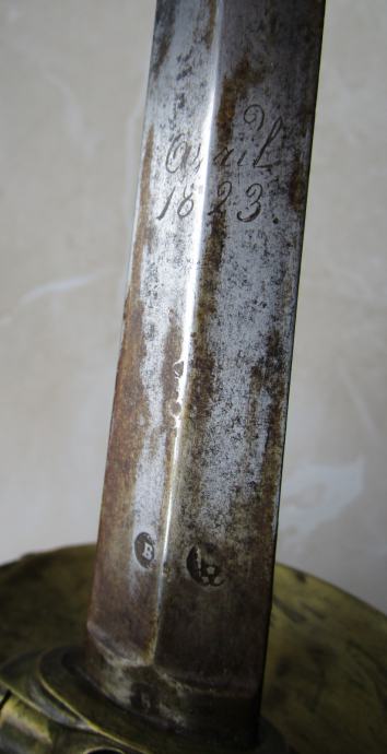 Dvorezno rezilo z osrednjim grebenom, širina pri dnu 2,5 cm, označeno in datirano z letnico 1823.