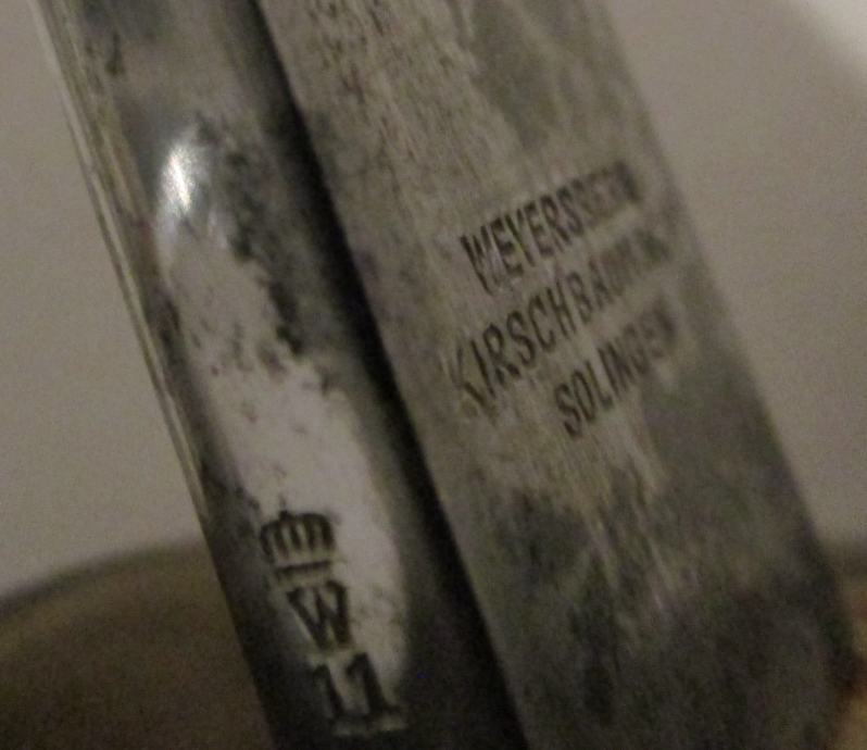 2) Pruski pehotni časniška (podčastniška ) sablja, model 1889 (enako kot častniški meči, vendar ima rezilo sprejemni žig W 11, kar pomeni, da je bil izdan leta 1911). Hrbtišče rezila je žigosano z oznako W11 in oznako izdelovalca rezila. Brez nožnice, redek! 400 €