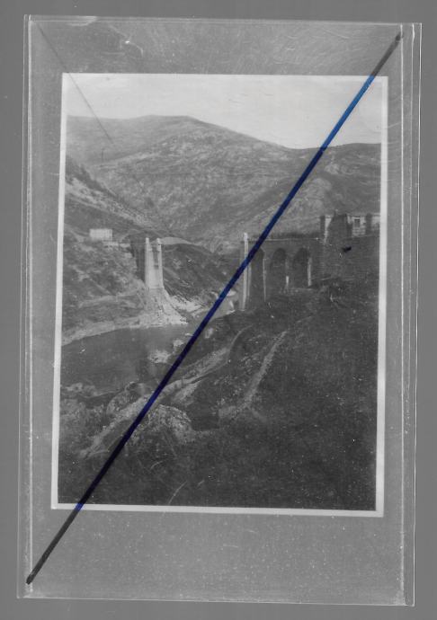 Naprodaj je fotografija porušenega mostu v Solkanu med prvo vojno, format 8,5 x 11 cm, zadaj napisi.