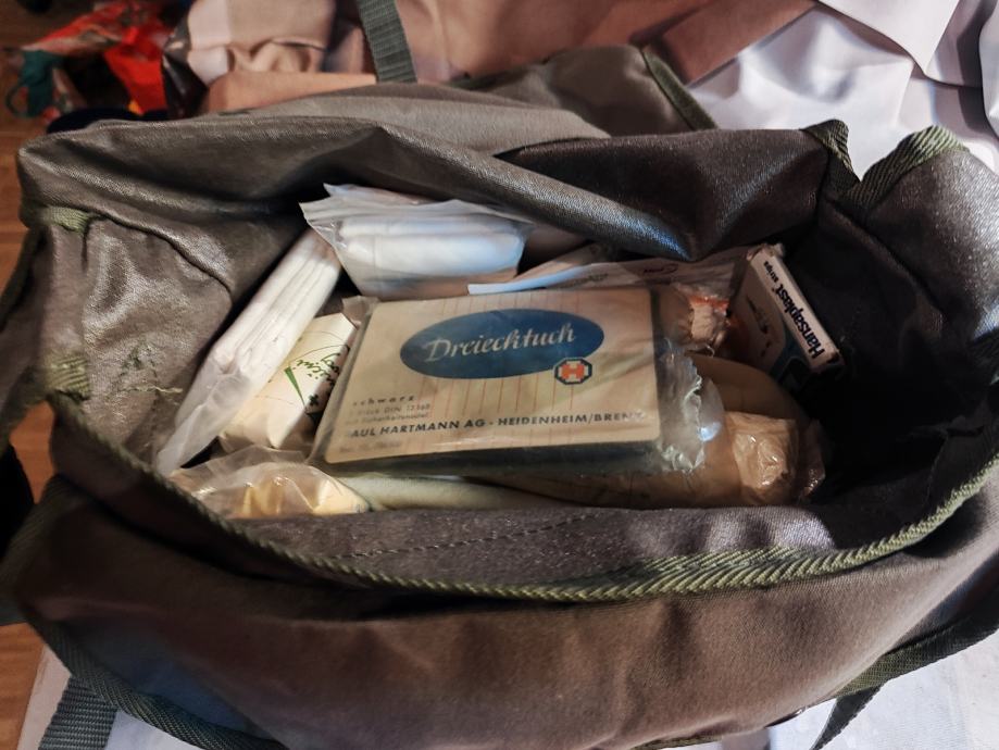 1. Stara: Ohranjena civilna/vojaška torba za prvo pomoc z nekaj vsebine.