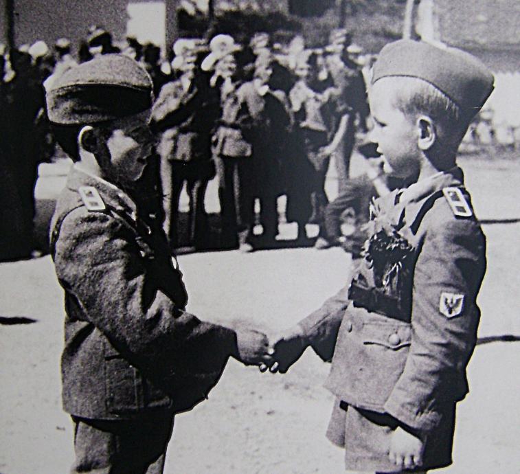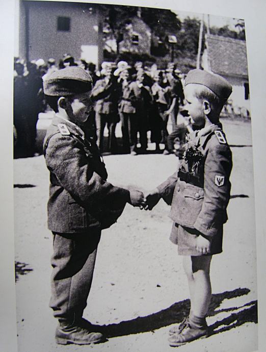 Dečka oblečena v otroško izvedbo domobranske uniforme,