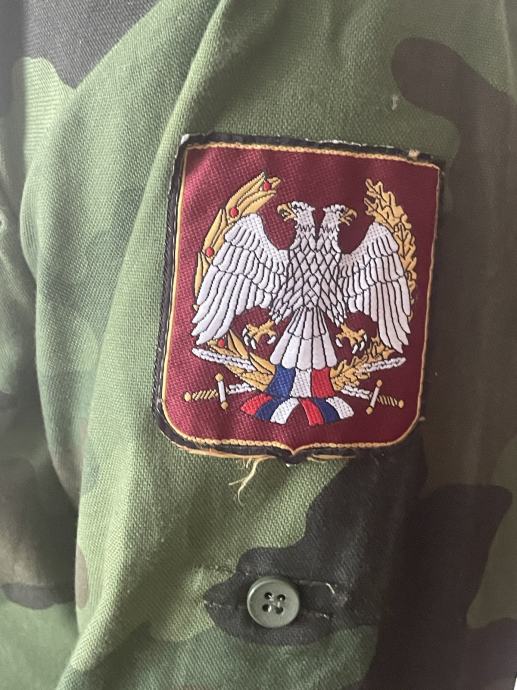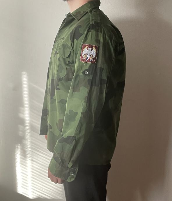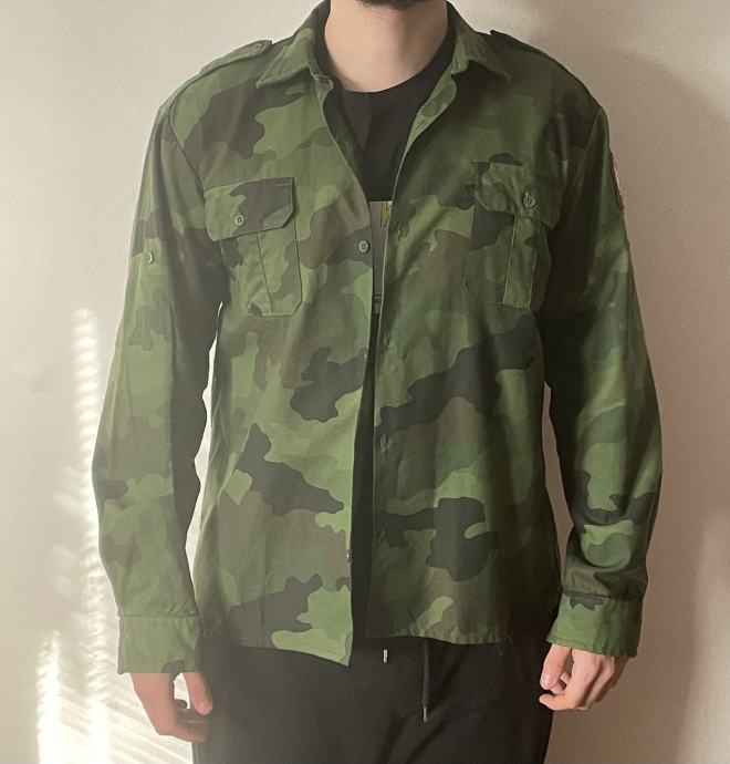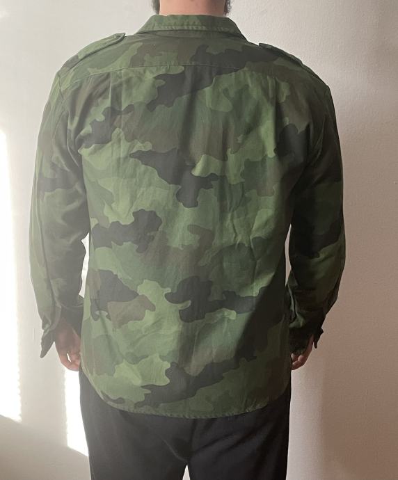 Nova, nikoli nosena vojaska M93 kamuflazna srajca Jugoslovanske vojske. Na etiketi mere: