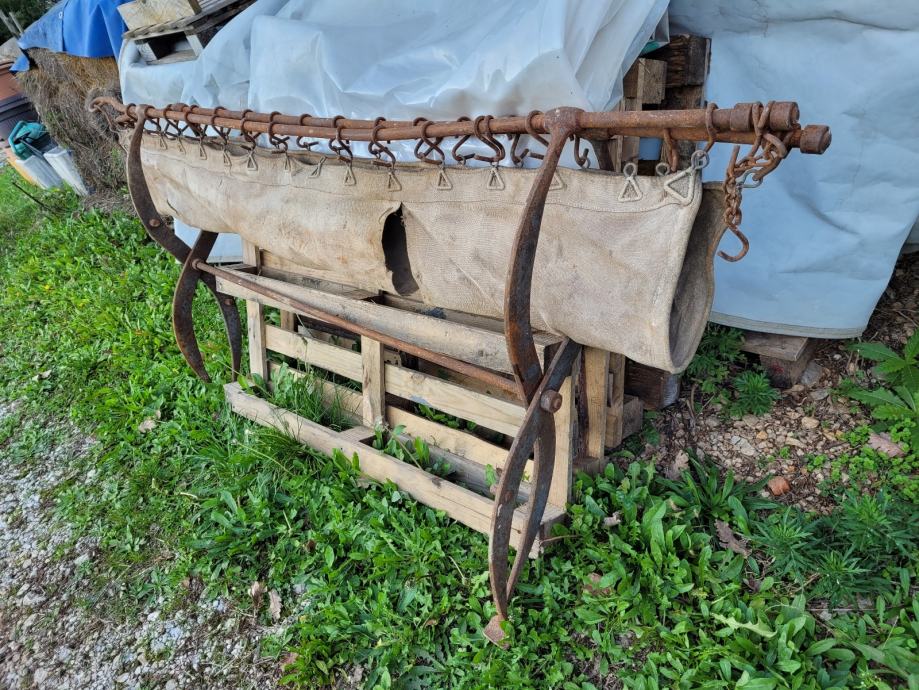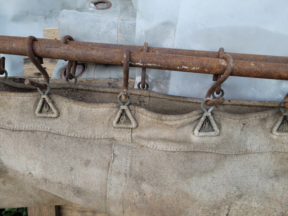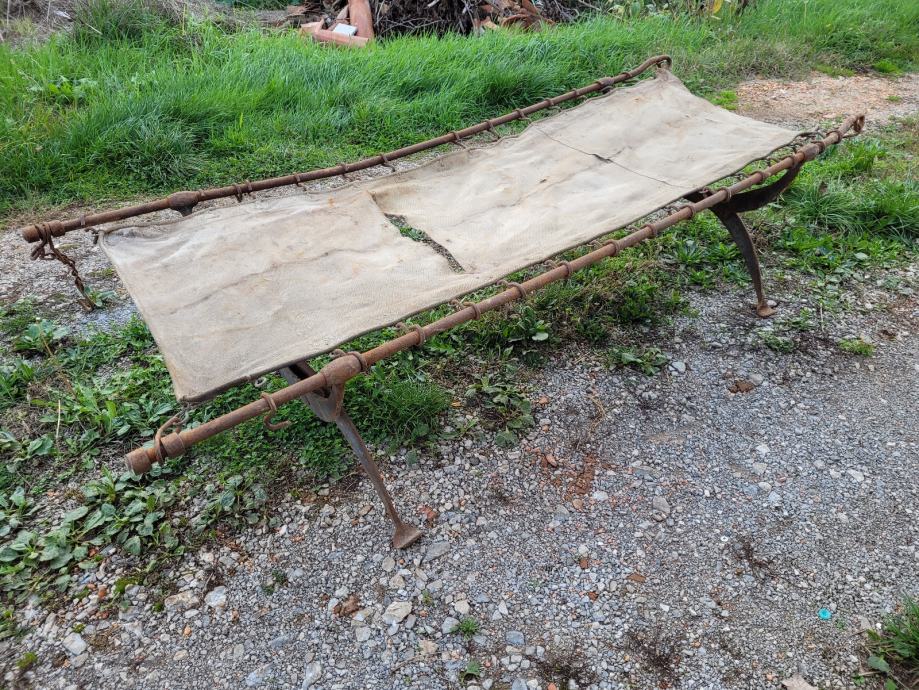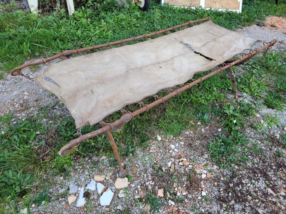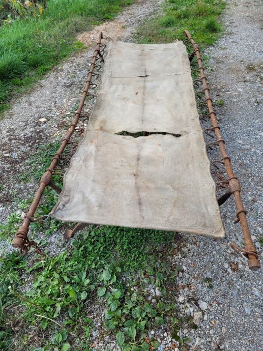 Vojaška postelja z originalnim platnom, model Branda 1913, najdena v Kostanjevici na Krasu