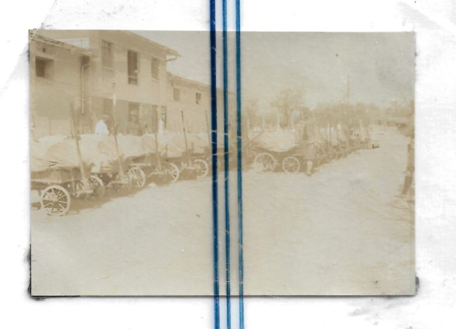 Fotografija postrojenja vozičkov za pasjo vprego, z njimi so na bojišče prevažali tudi municijo.