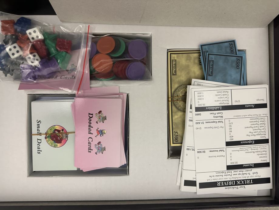 Komponente: Poklicne karte (začetni dohodek/stroški), Priložnosti (investicije), Tržnica, Nepričakovani stroški (Doodads), kocke, denar, igralne liste.