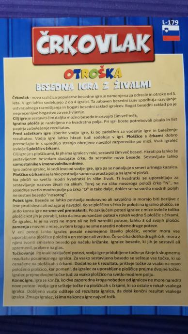Zaradi neuporabe prodam družabno igro Črkovlak, igra je nova, nerabljena. Notri manjkajo samo original navodila (prilagam pa zraven kopijo navodil).