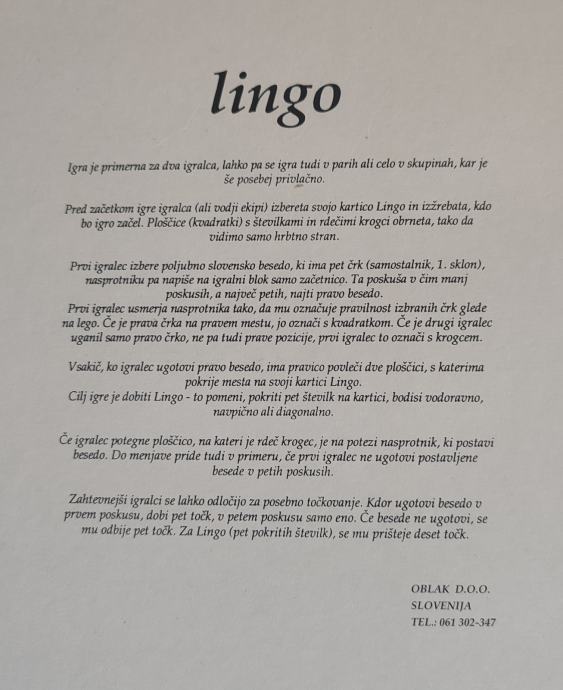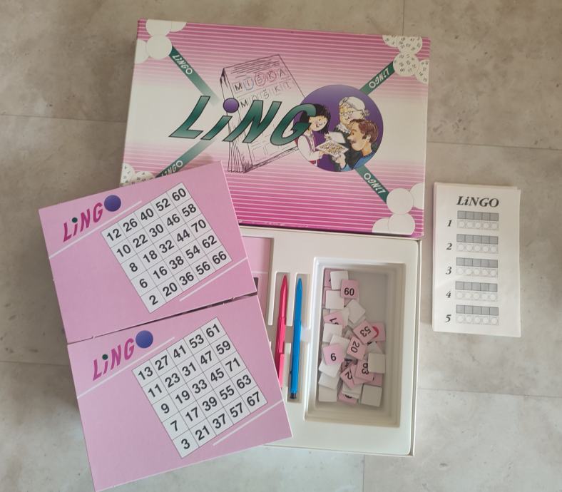 Družabna igra LINGO. Igra je primerna za 2 igralca, lahko pa se igra v parih ali skupinah. Pri igri se ugotavljajo besede in s tem zbirajo točke. Igra je kompletna z navodili na škatli.