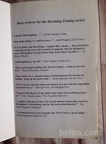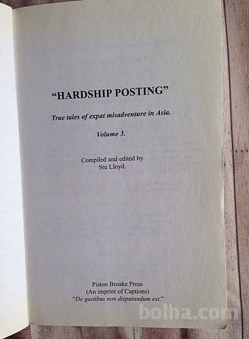 Prodam zbrane anekdote z naslovom "Hardship posting" True tales of expat misadventure in Asia, zgodbe je zbral Stu Lloyd, knjiga je v mehki izdaji, ima 350 strani, natisnjena v Avstraliji leta 2003, v angleškem jeziku. Knjiga je bila izdana v humanitarne namene, kot pomoč žrtvam terorističnega napada na Baliju, oktobra 2002. Knjiga je odlično ohranjena, predstavlja zabavno in kratkočasno branje ob katerem se boste nasmejali do solz.