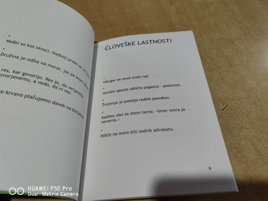 Aforizmi iz duhovitih in modrih rekov, sodb, se spreminjajo v privlačno izražanje, ki bralcu več ne odpira vrat stran od vsakdanjosti, ampak nasprotno - iz obrobja medijev mu ponuja bliskovit kolumen. V enem stavku, največ dveh. No, in prav tu najdemo Majo David. Zanjo je aforizem to, kar lahko pove bralcu s svojega vidika, kot svoje stališče. Nekaj je med njimi konkretnih naslonil, komentarjev na kadilce, politiko, zakon, pijanstvo, nekaj pa je splošnih pravil, ki naj bi osmislili vso nepreglednost in protislovnost vsakdanjega življenja ...