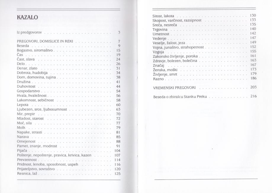 Najnovejši ponatis prinaša več kot 4600 pregovorov, domislic in izrekov, razvrščenih po pomenskih razdelkih. Tako so pravi zbir tehtnih življenjskih naukov in modrosti, ki sta nam jih ohranila čas in življenjska izkušnja.