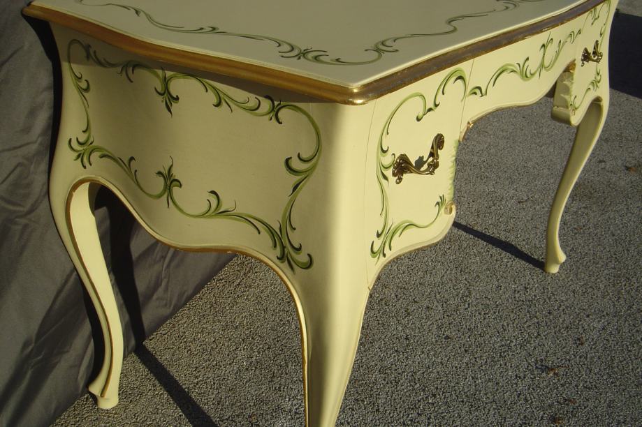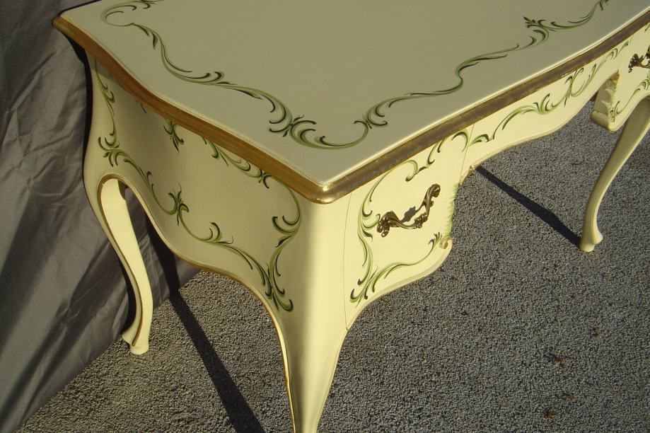 REDKOST* ATRAKTIVNA STARINSKA BAROČNA BENEŠKA PISALNA MIZA IZ MASIVNEGA LESA NA TRI PREDALA. V CELOTI Z VSEH STRANI PORISANA Z ZELENO IN OBROBE Z ZLATO BARVO. LAHKO SE POSTAVI SREDI PROSTORA, MEDENINASTO OKOVJE-ROČAJI. MIZA JE V ODLIČNEM STANJU.