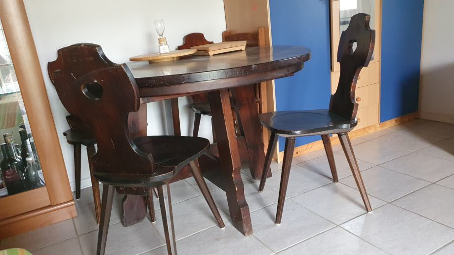 Miza iz pravega lesa, rocno delo mizarja. odlično ohranjena in 4 stoli z motivom srca.