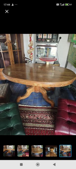 Masivna, ovalna lesena salonska miza z bogato izdelano nogo. Oreh. V 63 x D 147 x S 94 cm. Cena: 180 Euro