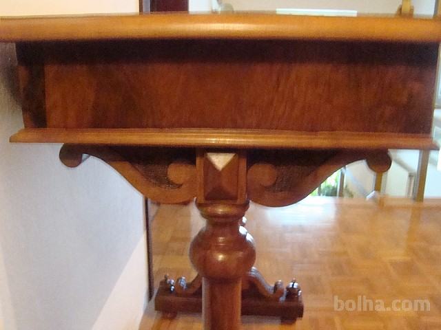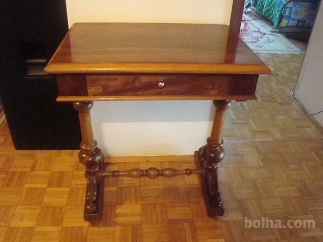 Miza, kot pisalna miza ali kot odlagalna miza, strokovno restavrirana, v odličnem stanu. Starost; cca. 120 let, mere; d 70 cm, š 49 cm, v 80 cm. Friz; okvir s predalom pod mizno ploščo,predal d 46 cm. Cena 400 eur oz. po dogovoru. Inf. 040 225 001