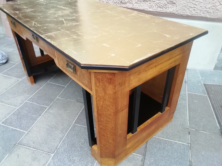 PISALNA MIZA, stara, večja, iz javorja, 3 predali, orig. okovje, pozlata na plošči, lepo ohranjena, dim. dol. 160cm,glob.80cm,prodam.tel.070/271-607.