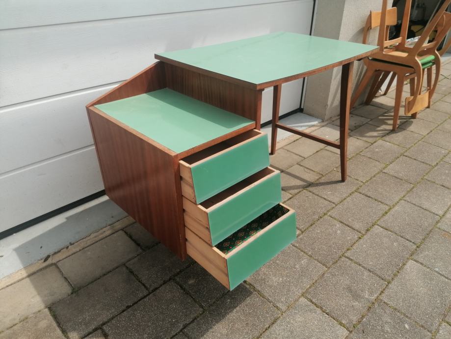 Lepo ohranjena, čvrsta, nepoškodovan. Lep kos pohištva iz šestdesetih let prejšnega stoletja. Dimenzije: širina 56, dolžina 115, višina 73, višina nizkega dela 59.