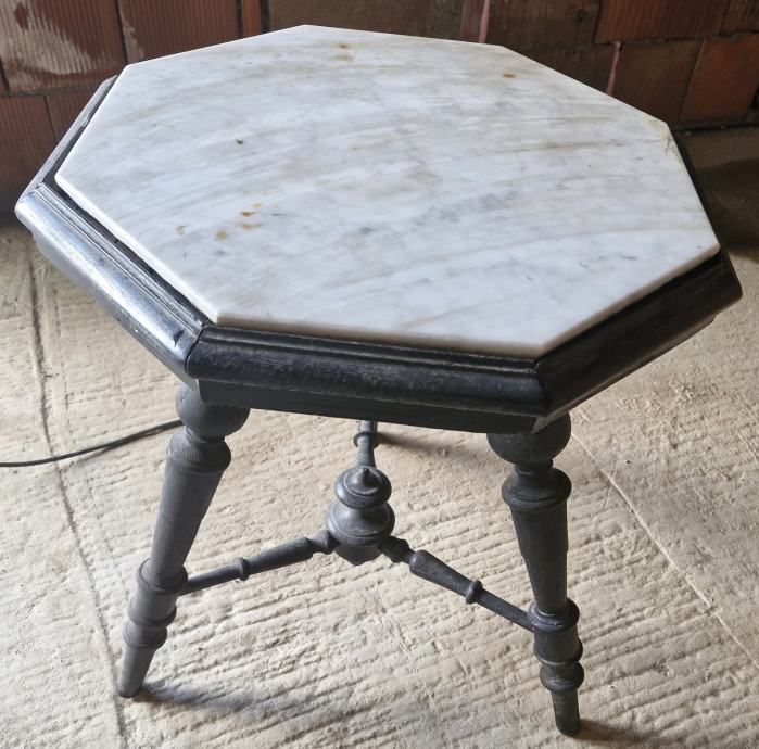 Prodam elegantno starinsko mizo z edinstveno osemkotno marmorno ploščo. Miza ima trpežen črn lesen okvir s čudovito oblikovanimi nogami, ki odlično dopolnjujejo klasičen videz. Idealna je kot okrasni kos pohištva, za dnevno sobo ali predsobo.