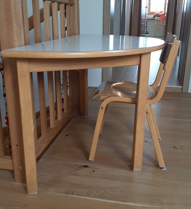Prodam otroško leseno mizo, polkrožne oblike, zelo praktična, ker ne zasede toliko prostora. Lesena masivna in stol.