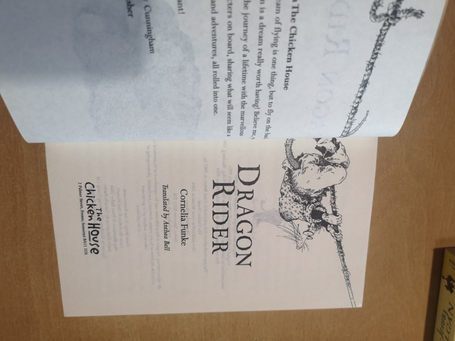 Dragon Rider is a 1997 German children's novel by Cornelia Funke. Originally translated by Oliver Latsch, Dragon Rider was published in English in 2004 by The Chicken House in the UK and Scholastic Inc. in the US, using a translation by Anthea Bell. Wikipedia