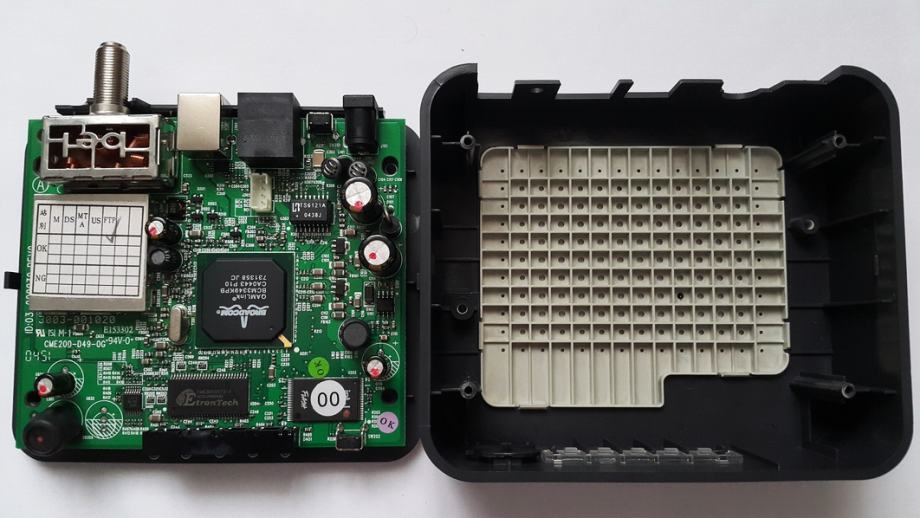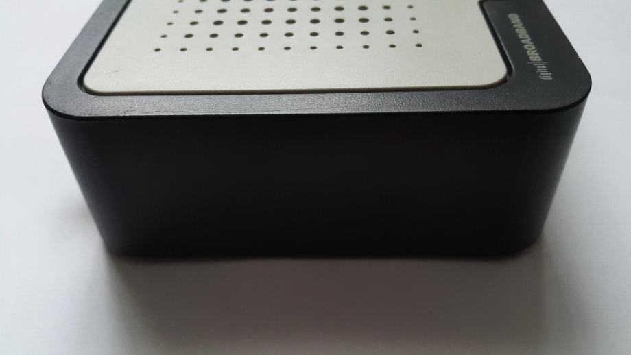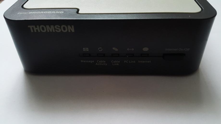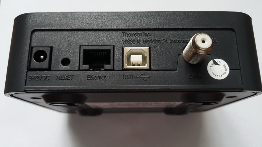Prodam naš star Thomsonov kabelski modem, model TCM420. Žal nimam več originalne embalaže, papirjev, zgoščenke od njega, niti prvotnega-originalnega napajalnika-adapterja. Če uporabim nek drug 12 V napajalni adapter, se prižge sicer normalno, a kaj bolj intenzivno testirat tega pa žal ne znam. Tako da se predvideva, da je pač delujoč, vendar če se naknadno ugotovi, da to ni res, vrnem denar. Mogoče bo komu prav prišlo recimo čipovje in ostali elektrotehniški elementi na tiskanem vezju modema (kdo ve). Kakorkoli... Že čaka na svojega novega lastnika.