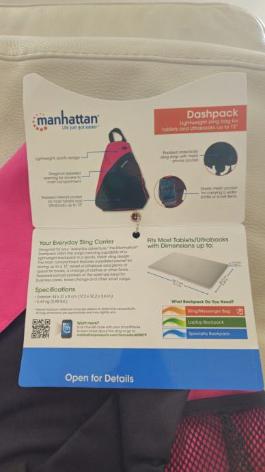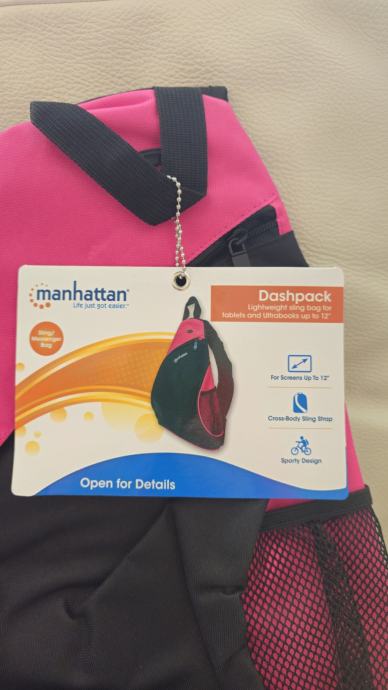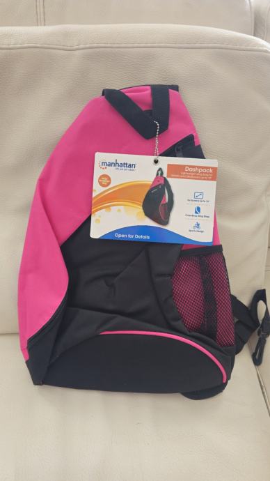 Prodam eno-ramenski nahrbtnik MANHATTAN, črno/roza barve, NOV, primeren za šport in prosti čas, kot modni dodatek ali tudi za tablico.