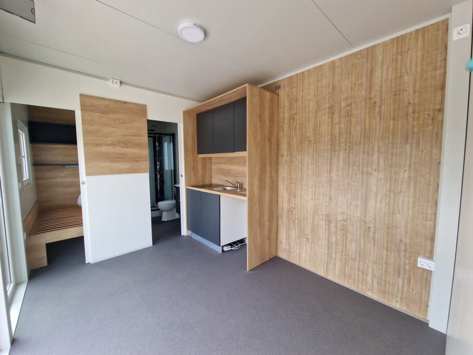 Mobilna hiška je zasnovana tako, da nudi popolno udobje ne glede na vremenske razmere. Izjemna izolacija zagotavlja energetsko učinkovitost in prijetno bivalno okolje. Odlična izbira za vikend, sezonsko bivanje ali celo kot trajno stanovanje!
