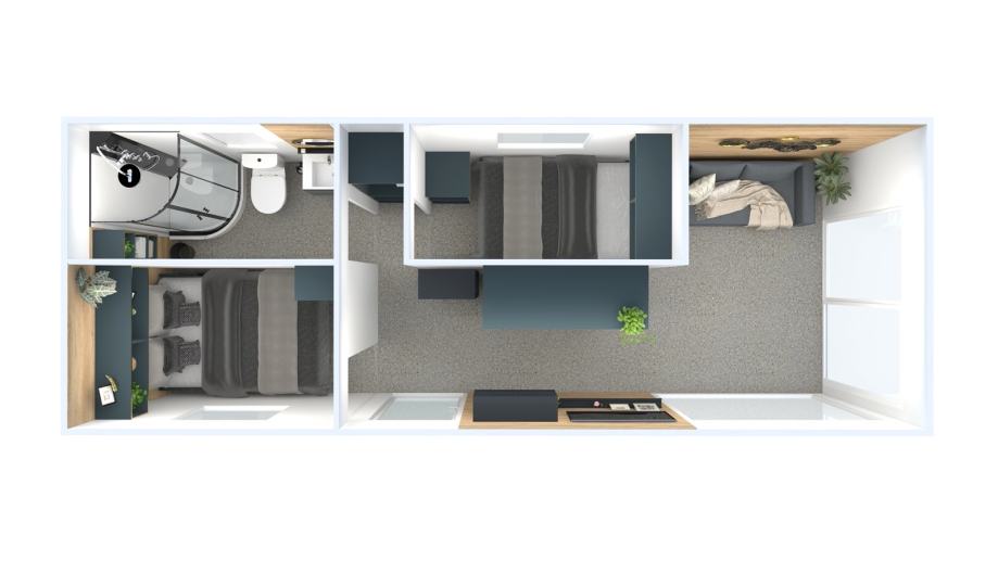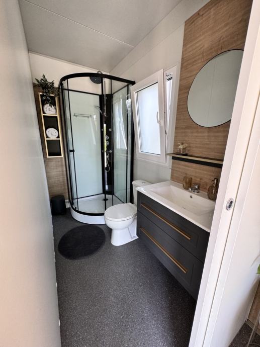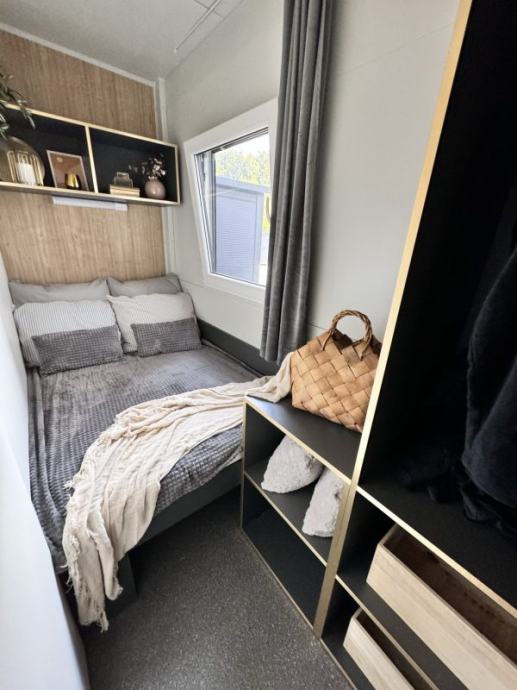 Hišica je popolnoma opremljena – vključuje kopalnico, kuhinjo, dnevni prostor in dve spalnici.