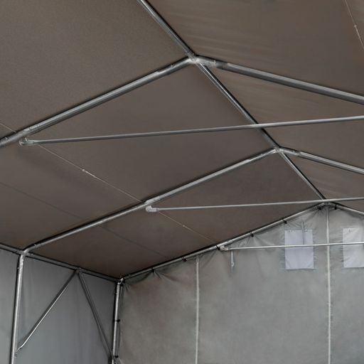 Ta konstrukcija šotora zagotavlja varnost, kljubuje vetru in vremenskim vplivom ter je zasnovana za celoletno uporabo. Skladiščna hala svojo izjemno stabilnost dolguje približno 50 % več jekla, ki je vgrajeno v njegove izjemno močna stojala in dodatne ojačitvene elemente na strehi in tleh. Na ta način se lahko sile optimalno razpršijo in šotor nudi zanesljivo zaščito skozi vse leto. Pocinkane jeklene cevi so odlična osnova. Zagotavljajo odlično zaščito pred korozijo in vremenskimi vplivi ter so manj občutljive na udarce. Debelina jekla in premer jeklene cevi sta posebej prilagojena visokim zahtevam, podaljšujeta dobo uporabe tega šotora in ga delata izjemno vzdržljivega.