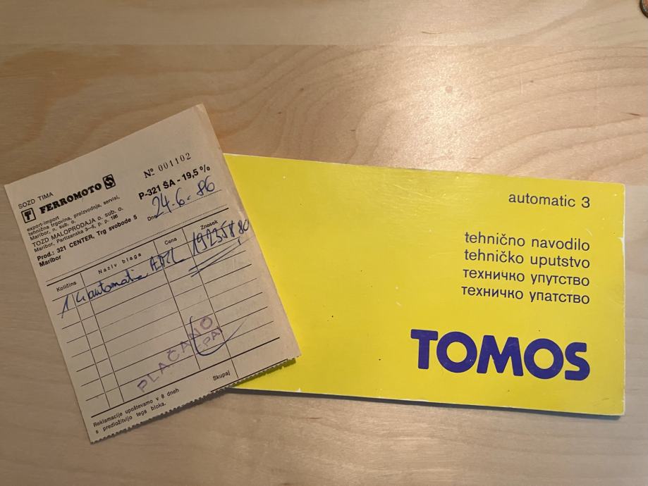 Zraven je še originalno Tomos tehnično navodilo, garancijski list in račun od nakupa iz leta 1986