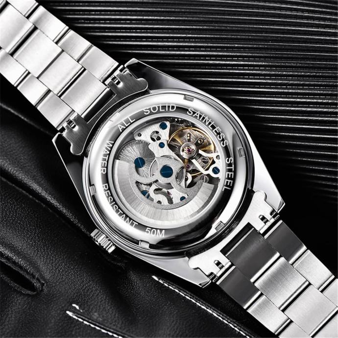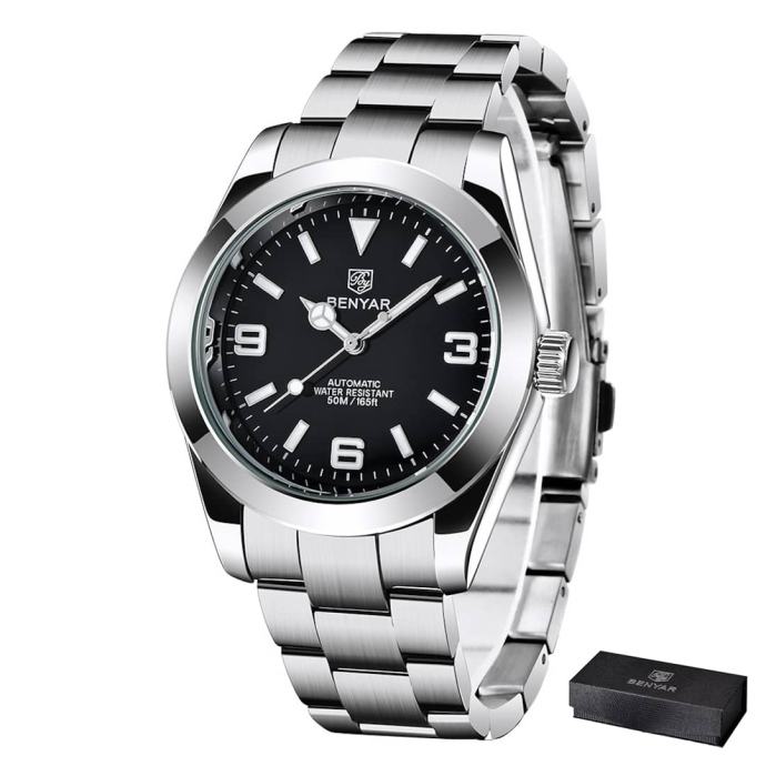 Moška ročna ura Benyar Automatic BlackMoška ročna ura Benyar Automatic Black združuje prefinjenost klasičnega dizajna in inovativnost mehanske tehnologije. Ta izjemna ura, z okroglim kovinskim ohišjem in minimalistično številčnico, ponuja več kot le eleganco; prinaša pravo izkušnjo za vse ljubitelje tradicionalnih ročnih ur. Moška ročna ura Benyar Automatic Black je popolna izbira za tiste, ki cenijo kakovost in stil. Uro poganja mehanski mehanizem, kar pomeni, da za delovanje ne potrebuje baterije. Njegov izjemno prijeten in topel “tik-tak” zvok bo razveselil resnične ljubitelje ročnih ur.Lastnosti in prednosti ure: Mehanski avtomatski mehanizem: Poganja se z avtomatskim mehanizmom, ki se sam navija med nošenjem ure. To pomeni, da ura ne potrebuje baterije in deluje na energijo, ki jo shranjuje v kovinskem peresu. Če ura ni v gibanju, jo lahko enostavno ročno navijete, kar omogoča neprekinjeno delovanje do približno 30 ur. Elegantna oblika: Ura ima klasično okroglo ohišje s premerom 42 mm, kar skupaj z minimalističnimi označbami in elegantnimi kazalci ustvari brezčasno estetiko. Kovinski pašček: Visoko sijajni kovinski pašček je nastavljiv z odstranitvijo členov, kar omogoča popolno prileganje zapestju, z minimalnim obsegom 14 cm in maksimalnim obsegom 20 cm. Luminiscenca: Luminiscenčni kazalci omogočajo enostavno odčitavanje časa tudi v temnih pogojih, kar povečuje praktičnost ure.Tehnične lastnosti: Mehanizem: Mehanski, avtomatski, analogni kronograf za precizno in zanesljivo delovanje brez potrebe po bateriji. Material ohišja: Kovinsko ohišje, ki zagotavlja dolgotrajnost in odpornost na obrabo. Velikost ohišja: 42 mm, kar omogoča udobno prileganje na zapestje, primerno za različne velikosti zapestja. Debelina ohišja: 15 mm, kar daje uri robusten in klasičen videz. Vrsta pasu: Kovinski pašček, nastavljiv in prilagodljiv za udobje ter eleganco. Teža: 150 g, kar omogoča trden občutek na zapestju brez kompromisov glede udobja. Vodoodpornost: 50 m (5 ATM), primerna za vsakodnevne aktivnosti.Zakaj izbrati moško ročno uro Benyar Automatic Black?Moška ročna ura Benyar Automatic Black je več kot le pripomoček za merjenje časa. Je simbol tradicije, natančnosti in elegance. Z mehanskim avtomatskim mehanizmom ponuja edinstveno izkušnjo nošenja ure, ki se sama navija in je brez potrebe po bateriji. Klasično oblikovano kovinsko ohišje in prilagodljiv kovinski pašček dodata pridih prestiža, ki ga bo cenil vsak ljubitelj ročnih ur. To je investicija v stil in kakovost, ki bo trajala skozi leta. Mehanske ure so tudi izjemno trpežne, saj ob ustreznem vzdrževanju lahko mehanizmi delujejo tudi več let. Mehanski mehanizmi so namenjeni za tiste, ki cenijo tradicijo in eleganco. Vendar pa zahtevajo nekoliko več nege in dela kot moderne ure s kvarčnim mehanizmom. Pri mehanskih urah se morate zavedati, da ne morejo zagotavljati tako natančnega merjenja časa kot ure s kvarčnim mehanizmom. Ampak če želite izkusiti nekaj posebnega in unikatnega, potem je mehanska ura prava izbira za vas.Nakup ročne ure je popolnoma brez tveganja, saj imate možnost, da v roku 60 dni po prejemu uro vrnete, mi pa vam vrnemo denar.Prav tako ima ročna ura 12-mesečno garancijo.Ročna ura bo tudi odlično darilo, saj jo boste prejeli v originalni Benyar darilni škatli.Sami se prepričajte o vrhunski kakovosti in elegantnem dizajnu ročne ure Benyar Automatic - ne boste razočarani!