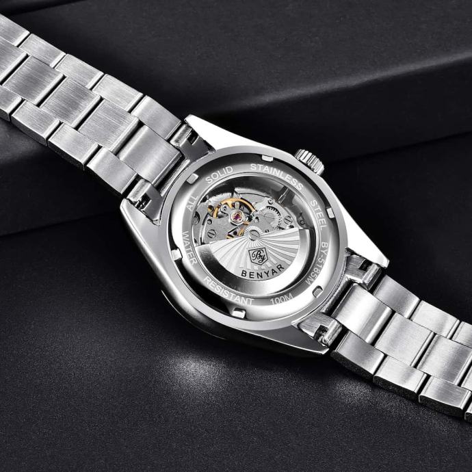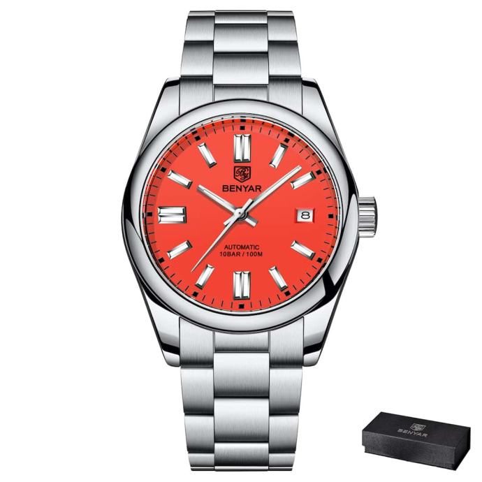 Moška ročna ura Benyar Automatic Perpetual RedMoška ročna ura Benyar Automatic Perpetual Red vas bo navdušila s svojo brezčasno eleganco in izjemno kakovostjo. Ta izjemna ura združuje klasičen dizajn in sodobno mehaniko, kar je popolno za ljubitelje tradicije in prefinjenosti. Z mehanskim avtomatskim mehanizmom in minimalističnim videzom je Benyar Automatic Perpetual Red več kot le ura—je pravi modni dodatek. Njegov izjemno prijeten in topel “tik-tak” zvok bo razveselil resnične ljubitelje ročnih ur.Lastnosti in prednosti ure: Mehanski avtomatski mehanizem: Uro poganja avtomatski mehanski mehanizem, ki se navija samodejno s premikanjem zapestja. To pomeni, da ura ne potrebuje baterije, saj deluje na energijo, ki se shranjuje v kovinskem peresu. Če ura ni v gibanju, jo lahko enostavno ročno navijete z vrtenjem krone v smeri urinega kazalca. Elegantna in minimalistična oblika: Ura ima okroglo kovinsko ohišje s premerom 39 mm. Njena preprosta številčnica in elegantni kazalci ustvarjajo brezčasen videz, primeren za vsakodnevno uporabo in posebne priložnosti. Kovinski pašček: Kovinski pašček ima visok sijaj in je nastavljiv z odstranitvijo členov. To omogoča popolno prileganje zapestju z obsegom od 14,5 cm do 20 cm. Luminiscenca: Svetleči kazalci in oznake za polne ure omogočajo enostavno odčitavanje časa tudi v temi. Prikaz datuma: Ura vključuje funkcijo prikaza datuma, kar doda dodatno praktičnost za vsakodnevno uporabo. Vodoodpornost: Vodoodpornost do 100 m (10 ATM) omogoča uporabo ure pri plavanju in drugih vodnih aktivnostih.Tehnične lastnosti: Mehanizem: Mehanski avtomatski mehanizem za zanesljivo delovanje brez potrebe po bateriji. Material ohišja: Kovinsko ohišje za dolgotrajnost in odpornost na obrabo. Velikost ohišja: 39 mm, kar omogoča udobno prileganje na zapestje, primerno za različne velikosti zapestja. Debelina ohišja: 12 mm, kar daje uri eleganten in subtilen videz. Vrsta pasu: Kovinski pašček, prilagodljiv in trpežen, za udobje in dolgo življenjsko dobo. Teža: 145 g, kar daje uri robusten občutek, vendar je še vedno udobna za nošenje.Zakaj izbrati moško ročno uro Benyar Automatic Perpetual Red?Moška ročna ura Benyar Automatic Perpetual Red ni le estetski dodatek, ampak tudi tehnološki dosežek, ki združuje tradicionalno obrtnost z modernimi funkcijami. Njena mehanska avtomatska narava omogoča brezskrbno nošenje brez potrebe po menjavi baterij, medtem ko njen klasičen dizajn in funkcionalnost, kot sta luminiscenca in prikaz datuma, zagotavljata vsestransko uporabnost. Z vodoodpornostjo do 100 metrov je ura primerna za vsakodnevne aktivnosti in vodne športe, kar ji daje dodatno vrednost in praktičnost. S to uro boste izžarevali stil in zanesljivost, ne glede na priložnost. Mehanski mehanizmi so namenjeni za tiste, ki cenijo tradicijo in eleganco. Vendar pa zahtevajo nekoliko več nege in dela kot moderne ure s kvarčnim mehanizmom. Pri mehanskih urah se morate zavedati, da ne morejo zagotavljati tako natančnega merjenja časa kot ure s kvarčnim mehanizmom. Ampak če želite izkusiti nekaj posebnega in unikatnega, potem je mehanska ura prava izbira za vas.Nakup ročne ure je popolnoma brez tveganja, saj imate možnost, da v roku 60 dni po prejemu uro vrnete, mi pa vam vrnemo denar.Prav tako ima ročna ura 12-mesečno garancijo.Ročna ura bo tudi odlično darilo, saj jo boste prejeli v originalni Benyar darilni škatlici.Sami se prepričajte o vrhunski kakovosti in elegantnem dizajnu ročne ure Benyar Automatic - ne boste razočarani!
