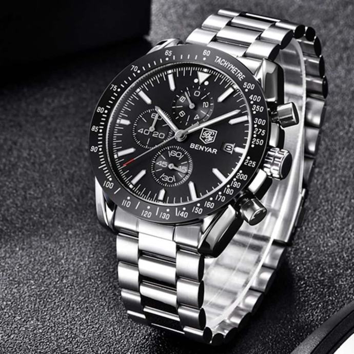 Moška ročna ura Benyar Cosmos Metal Black SilverMoška ročna ura Benyar Cosmos Metal Black Silver je prestižna športno elegantna ura, ki združuje stil in funkcionalnost. Z analognim prikazovalnikom in kronografom je ta model idealen za moške, ki cenijo prefinjen dizajn in natančnost. Kovinski pašček v kombinaciji s tremi kronografi poudarja športno eleganco, ki je primerna tako za poslovne kot za sproščene priložnosti.Lastnosti in prednosti ure: Športna eleganca: Ura združuje robusten kovinski pašček in sodoben dizajn, kar ji daje športno eleganten videz, primeren za vsak stil oblačenja. Pašček je mogoče prilagoditi na poljubno dolžino z odstranitvijo poljubnega števila členov, kar zagotavlja udobno prileganje vsakemu zapestju. Napredni kronograf: Ura vključuje tri kronografe za natančno merjenje časa – zgornji prikazuje 1/10 sekunde, spodnji sekunde, levi pa minute. To omogoča hitro in enostavno merjenje časa z enim pritiskom. Kakovostno konveksno Hardlex steklo: Izbočeno steklo poskrbi za poseben odsev svetlobe, ki daje uri luksuzen videz, običajno rezerviran za dražje modele. Japonski Quartz mehanizem: Visokokakovostni mehanizem zagotavlja natančnost in zanesljivost, kar pomeni, da bo ura vedno točna in pripravljena na akcijo. Luminiscenca: Kazalci in oznake se svetijo v temi, kar omogoča enostavno berljivost tudi v slabših svetlobnih pogojih.Tehnične lastnosti: Mehanizem: Analogni kronograf, ki združuje klasično uro z naprednimi funkcijami za merjenje časa in prikaz datuma. Material ohišja: Trpežno kovinsko ohišje zagotavlja vzdržljivost in dolgoročno uporabo, hkrati pa ohranja eleganten videz. Velikost ohišja: 45 mm, kar zagotavlja dobro vidljivost in jasen prikaz številčnice. Debelina ohišja: 16 mm, ki združuje robustnost z elegantnim stilom, kar je primerno za vse priložnosti. Funkcije: Datum, luminiscenca in štoparica, ki omogočajo dodatno funkcionalnost in praktičnost. Pašček: Kovinski pašček iz nerjavečega jekla, ki je trpežen in eleganten. Dolžino paščka lahko prilagodite z odstranitvijo poljubnega števila členov, kar omogoča popolno prileganje in udobje pri nošenju. Teža: 170 g – dovolj robustna za stabilnost, a še vedno udobna za vsakodnevno nošenje.Zakaj izbrati moško ročno uro Benyar Cosmos Metal Black Silver?Moška ročna ura Benyar Cosmos Metal Black Silver je odlična izbira za tiste, ki iščejo uro, ki združuje eleganco in funkcionalnost. S svojim športno elegantnim dizajnom, trpežnim kovinskim paščkom in naprednimi funkcijami, kot so kronograf, luminiscenca in prikaz datuma, je ta ura idealna za vse priložnosti. Dodajte Benyar Cosmos Metal Black Silver svoji zbirki in uživajte v prefinjenem dizajnu in natančnosti, ki ju ponuja. Prepričajte se sami o kakovosti in stilu, ki ga ta ura prinaša!Vaš nakup ročne ure je popolnoma brez tveganja. Saj v kolikor z nakupom niste zadovoljni, lahko naročeno v roku 60-ih dni od prejema vrnete na naš naslov. Mi pa vam bomo vrnili denar.Ročna ura ima 12 mesecev garancije.Ura je primerna tudi za darilo, saj vam bo nakupu, podarimo originalno Benyar darilno škatlico.