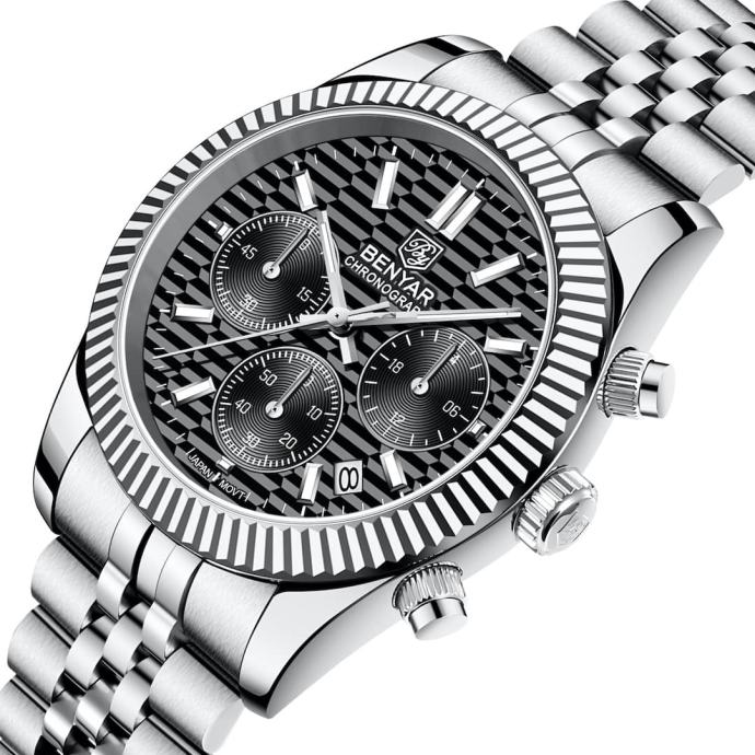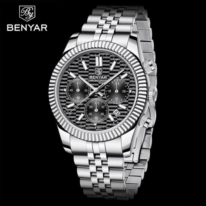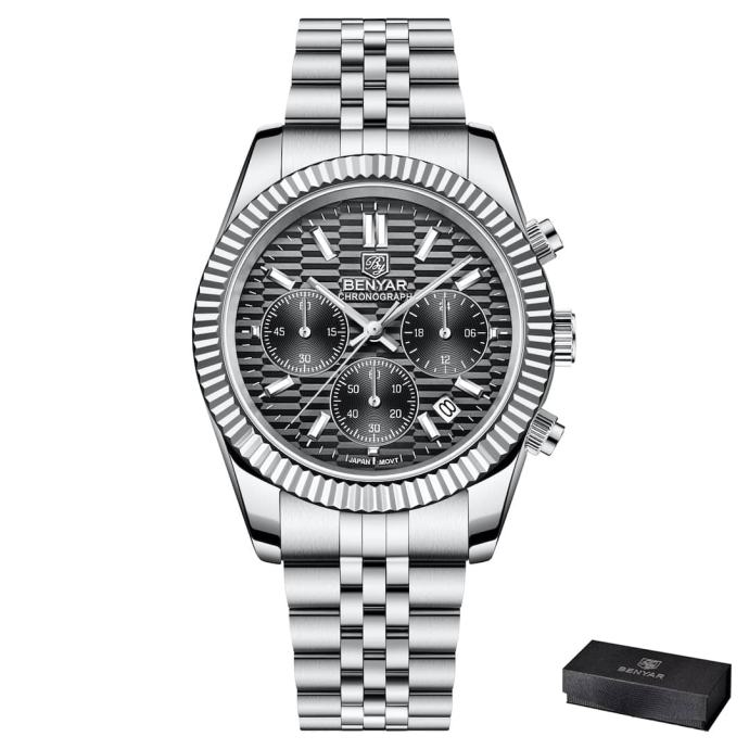 Moška ročna ura Benyar Ocean BlackMoška ročna ura Benyar Ocean Black vam prinaša vrhunsko eleganco — nepogrešljiv dodatek za vaš stil in zanesljiv partner za natančno merjenje časa. Ta ura izstopa s svojim klasičnim dizajnom in subtilno privlačnostjo, ki pritegne poglede in vzbuja občudovanje. Poleg osnovnih funkcij, kot sta prikaz ure in datuma, ima tudi vgrajeno štoparico, ki omogoča izjemno natančno merjenje časa.Lastnosti in prednosti ure: Kronografske funkcije: Ura je opremljena s tremi kronografi, ki omogočajo natančno merjenje časa. Levi kronograf meri minute štoparice, spodnji meri sekunde štoparice, desni pa prikazuje 24-urni časovni format. Elegantno oblikovanje: Ohišje okoli številčnice je oblikovano s prefinjenostjo, ki spominja na kraljevsko krono, medtem ko tekstura številčnice spominja na valovanje morja. Luminiscenca: Svetleči kazalci omogočajo enostavno odčitavanje časa tudi v temi, kar povečuje uporabnost ure. Trpežnost in udobje: Kovinsko ohišje iz nerjavečega jekla debeline 11 mm zagotavlja trpežnost in močan občutek. Kovinski pas iz nerjavečega jekla s širino 18 mm je nastavljiv z odstranitvijo členov, kar omogoča popolno prileganje zapestju z obsegom od 16 cm do 20 cm.Tehnične lastnosti: Mehanizem: Analogni kvarčni mehanizem za zanesljivo in natančno merjenje časa. Material ohišja: Kovinsko ohišje iz nerjavečega jekla, ki zagotavlja dolgotrajnost in odpornost na obrabo. Velikost ohišja: 40 mm, kar omogoča udobno prileganje na zapestju. Debelina ohišja: 11 mm, kar daje uri eleganten in subtilen profil. Vrsta pasu: Kovinski pas iz nerjavečega jekla, prilagodljiv za različne velikosti zapestja. Teža: 130 g, kar daje uri robusten občutek, vendar je še vedno udobna za nošenje.Zakaj izbrati moško ročno uro Benyar Ocean Black?Moška ročna ura Benyar Ocean Black združuje eleganco in funkcionalnost v eni čudoviti uri. S svojimi kronografskimi funkcijami, prikazom datuma in luminiscenčnimi kazalci zagotavlja zanesljivo delovanje in enostavno uporabo v različnih pogojih. Zaradi vodoodpornosti do 100 metrov je primerna za plavanje in druge vodne aktivnosti. Poleg tega kovinsko ohišje in pas iz nerjavečega jekla zagotavljata vzdržljivost in trpežnost, kar vam omogoča, da jo nosite vsak dan. Ura Benyar Ocean Black je prava izbira za moške, ki iščejo zanesljivo in stilsko uro, ki izstopa.Vaš nakup te ročne ure je popolnoma brez tveganja. Če z nakupom niste zadovoljni, lahko izdelek v 60 dneh po prejemu vrnete na naš naslov, in mi vam bomo vrnili denar.Poleg tega ima ura 12-mesečno garancijo.Ura je odlična tudi kot darilo, saj vam ob nakupu priložimo originalno Benyar darilno škatlico.