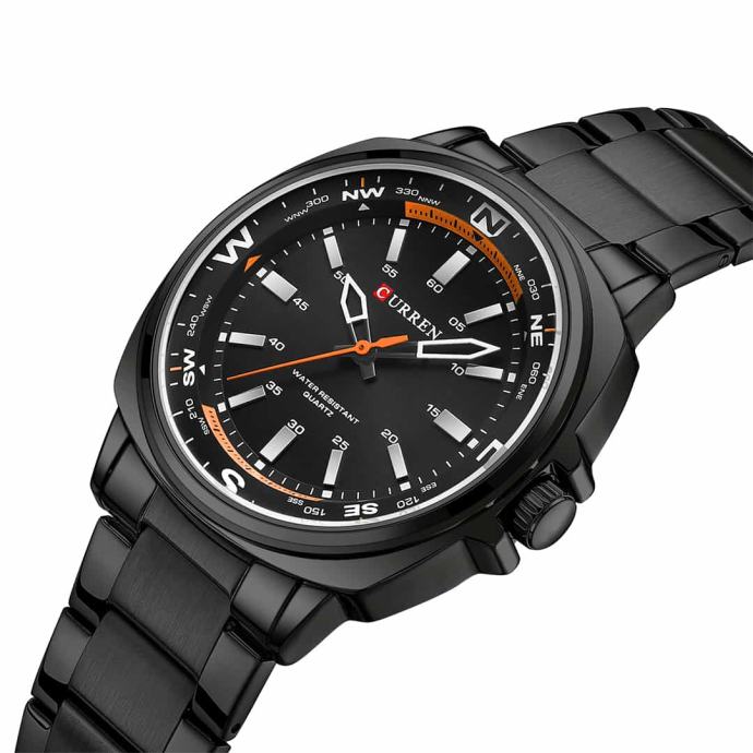 Moška ročna ura Curren Zenith BlackCurren Zenith Black je moška ročna ura, ki združuje športni značaj in eleganco. Njena prefinjena črna številčnica z oranžnimi in belimi poudarki poudarja dinamičen dizajn, medtem ko robustno črno ohišje iz nerjavečega jekla zagotavlja vzdržljivost. S svojo vsestranskostjo je popolna izbira za sodobnega moškega, ki potrebuje zanesljivo uro za vsakodnevno nošenje ali posebne priložnosti.Lastnosti in prednosti ure: Športno-eleganten dizajn: Črna številčnica z oranžnimi in belimi poudarki ustvarja sodoben in dinamičen videz. Trpežno ohišje: Izdelano iz črnega nerjavečega jekla s premerom 41 mm za prestižen in robusten občutek. Kvarčni mehanizem: Zagotavlja izjemno natančnost in zanesljivo delovanje. Mineralno steklo: Odporno na praske in manjše udarce za dolgotrajno brezhiben videz. Vodoodpornost 3 ATM: Primerna za vsakodnevno uporabo, odporna na pršenje vode in dež. Udoben kovinski pašček: Črno nerjaveče jeklo z maksimalnim obsegom 20 cm zagotavlja varno prileganje in udobno nošenje.Tehnične lastnosti: Premer ohišja: 41 mm – idealna velikost za športno-eleganten videz. Debelina ohišja: 11 mm – omogoča udobno nošenje skozi ves dan. Material ohišja: Črno nerjaveče jeklo – zagotavlja dolgotrajno vzdržljivost in kakovost. Steklo: Mineralno – odporno na praske in udarce. Pašček: Kovinski, nastavljiv obseg do 20 cm – udoben in prilagodljiv. Mehanizem: Kvarčni – omogoča natančno merjenje časa brez odstopanj.Zakaj izbrati moško ročno uro Curren Zenith Black?Curren Zenith Black je popolna kombinacija športnega in elegantnega videza. Njena prepoznavna črna številčnica s kontrastnimi detajli in robustna konstrukcija jo naredita odlično izbiro za vsakodnevno uporabo ali posebne priložnosti. Če želite uro, ki združuje slog, funkcionalnost in vzdržljivost, je ta model prava izbira za vas!V kolikor z nakupom niste zadovoljni, lahko ročno uro v roku 60-ih dni od prejema vrnete na naš naslov. Mi pa vam bomo vrnili kupnino.Ročna ura ima 12 mesecev garancije.