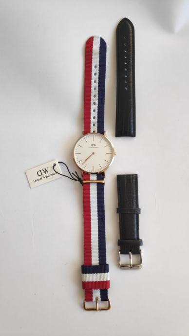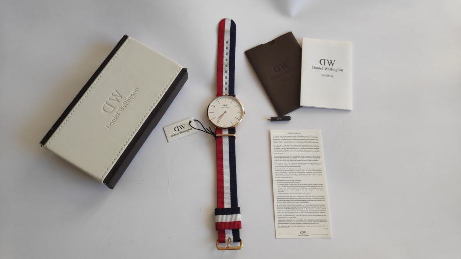 Prodam original moško ročno uro Daniel Wellington. Elegantna in sofisticirana ročna ura je preproste in minimalistične oblike. Ohišje je iz nerjavečega jekla, celoten videz zaključi kombinacija modro rdeče belega paščka iz blaga (t.i. nato strap). Premer ohišja je 40mm. Je nepoškodovana, nova, nima niti ene praske.