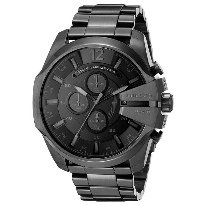 Moška ročna ura Diesel Mega Chief DZ4355 je športna ročna ura s kronografom. Diesel ure so znane po svoji obliki in definitivno izstopajo od vseh ostalih ročnih ur. Ura je s svojimi 53 mm premera in 200 g resnično masivna.Poleg tega, da ura kar kliče po pozornosti, je tudi uporabna. Poleg prikaza datuma ima kronograf - štoparico s kar tremi kronografi. Oblikovalci te ure so se posvetili tudi detajlom, kot je tridimenzionalna številčnica, ipd.Ohišje ure in pašček sta iz nerjavečega jekla črne barve. Nerjaveče jeklo (316L) je zelo trpežen material, ki se ne upogiba in lomi in je barvno obstojno. Dodatna pozitivna lasnost tega materiala je, da antialergenski (ne reagira s telesnimi tekočinami), tako se kovinske komponente ne sproščajo v telo. Površina je odporna proti oksidaciji in koroziji.Ura ima oznako vodotesnosti kar 100 m (10 ATM), kar pomeni, da ta ura prenese tudi večje vodne šoke.Ura ima 12 mesečno garancijo.V kolikor z nakupom niste zadovoljni, lahko ročno uro v roku 60-ih dni od prejema vrnete na naš naslov, mi pa vam bomo vrnili kupnino.Ročno ura ura je idealna tudi za darilo, saj jo prejmete v originalni Diesel darilni škatlici in originalnimi navodili.