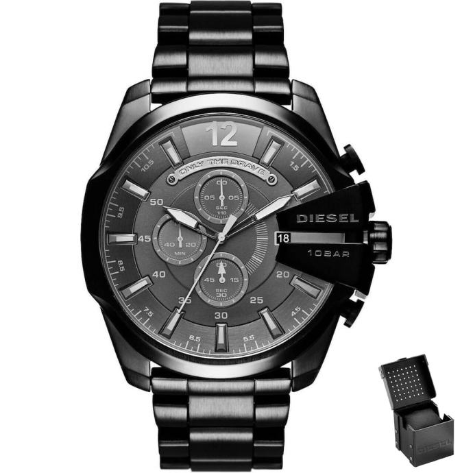 Moška ročna ura Diesel Mega Chief DZ4355 je športna ročna ura s kronografom. Diesel ure so znane po svoji obliki in definitivno izstopajo od vseh ostalih ročnih ur. Ura je s svojimi 53 mm premera in 200 g resnično masivna.Poleg tega, da ura kar kliče po pozornosti, je tudi uporabna. Poleg prikaza datuma ima kronograf - štoparico s kar tremi kronografi. Oblikovalci te ure so se posvetili tudi detajlom, kot je tridimenzionalna številčnica, ipd.Ohišje ure in pašček sta iz nerjavečega jekla črne barve. Nerjaveče jeklo (316L) je zelo trpežen material, ki se ne upogiba in lomi in je barvno obstojno. Dodatna pozitivna lasnost tega materiala je, da antialergenski (ne reagira s telesnimi tekočinami), tako se kovinske komponente ne sproščajo v telo. Površina je odporna proti oksidaciji in koroziji.Ura ima oznako vodotesnosti kar 100 m (10 ATM), kar pomeni, da ta ura prenese tudi večje vodne šoke.Ura ima 12 mesečno garancijo.V kolikor z nakupom niste zadovoljni, lahko ročno uro v roku 60-ih dni od prejema vrnete na naš naslov, mi pa vam bomo vrnili kupnino.Ročno ura ura je idealna tudi za darilo, saj jo prejmete v originalni Diesel darilni škatlici in originalnimi navodili.