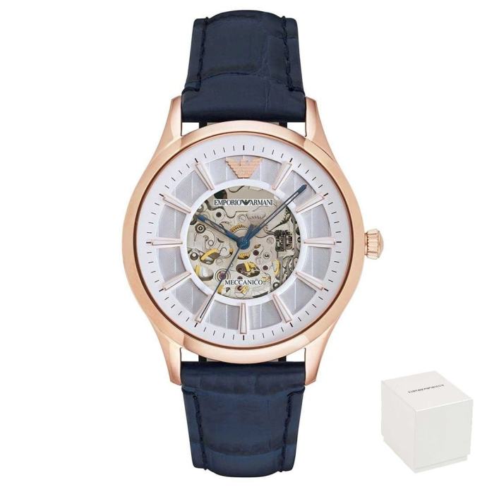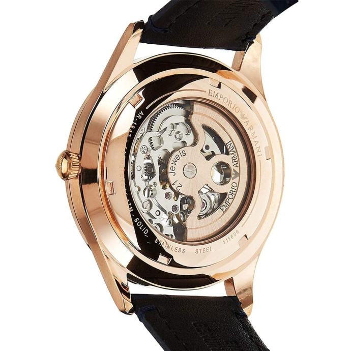 Emporio Armani AR1947 je neverjetna in privlačna moška ura. Rose gold ohišje je izdelano iz nerjavečega jekla. Prosojna številčnica pa omogoča vpogled v avtomatski mehanizem ure, kar daje uri edinstven videz. Izgled ure zaokroži moder usnjen pašček.Avtomatski mehanizem pomeni, da uro poganja energija shranjena v kovinskem peresu. Ura se navija sama, medtem ko jo vi nosite. Če je potrebno, se lahko mehanizem tudi ročno navije. To storite tako, da krono zavrtite v smeri urinega kazalca. Ura z enim navijanjem teče približno 40 ur.Ohišje ure je iz nerjavečega jekla rose gold barve. Nerjaveče jeklo (316L) je zelo trpežen material, ki se ne upogiba in lomi in je barvno obstojno. Dodatna pozitivna lasnost tega materiala je, da antialergenski (ne reagira s telesnimi tekočinami), tako se kovinske komponente ne sproščajo v telo. Površina je odporna proti oksidaciji in koroziji.Ura ima oznako vodotesnosti 50 metrov (5 ATM), kar pomeni, da se z uro lahko tudi tuširate.Ura ima 12 mesečno garancijo.V kolikor z nakupom niste zadovoljni, lahko ročno uro v roku 60-ih dni od prejema vrnete na naš naslov, mi pa vam bomo vrnili kupnino.Paket vsebuje: Ročno uro Emporio Armani AR1647 Originalno embalažo Navodila Certifikat o originalnem izdelkuRočno ura ura je idealna tudi za darilo, saj jo prejmete v originalni Emporio Armani darilni škatlici.