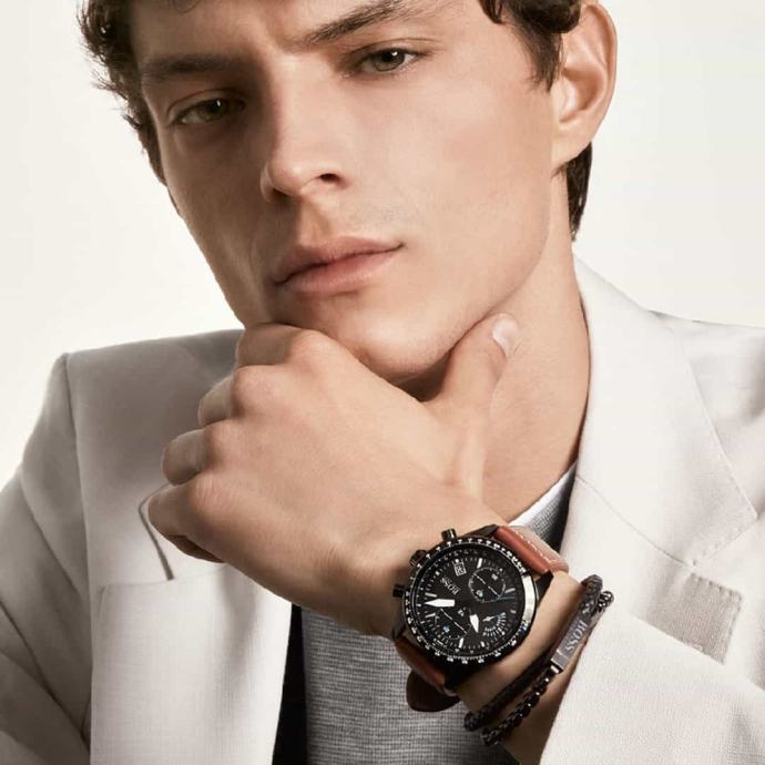Moška ročna ura Hugo Boss Pilot Edition Chrono 1513851Moška ročna ura Hugo Boss Pilot Edition Chrono 1513854 je funkcionalna in elegantna ura, zasnovana za moške, ki cenijo natančnost in brezčasen dizajn. Ohišje iz nerjavečega jekla v črni barvi v kombinaciji z rjavim usnjenim paščkom ustvarja prefinjen kontrast, ki izstopa tako v poslovnem kot sproščenem okolju. Kronografski mehanizem omogoča natančno merjenje časa, medtem ko vodoodpornost do 5 ATM zagotavlja brezskrbno uporabo v vsakdanjem življenju.Lastnosti in prednosti ure: Drzni in retrogradni kronografski mehanizem: Poseben retrogradni mehanizem omogoča natančno merjenje časa z dodatno dimenzijo gibanja kazalcev, kar doda urejen videz in funkcionalnost. Kakovosten rjav usnjen pašček: Udoben, trpežen in prilagodljiv, s kontrastnim šivom za dodaten pridih elegance. Prikaz datuma: Datumsko okence ob 4. uri zagotavlja dodatno praktičnost pri vsakodnevni uporabi. Eleganten in robusten dizajn: Kombinacija črnega ohišja in številčnice ustvarja privlačen kontrast, ki poudarja športno-eleganten videz. Luminescenčni kazalci in oznake: Svetleči kazalci in oznake na številčnici zagotavljajo berljivost tudi v temi, kar povečuje uporabnost ure v vseh pogojih. Vodoodpornost 50 m (5 ATM): Ura je primerna za vsakodnevno uporabo, vključno s tuširanjem in rahlimi stiki z vodo, kar ji omogoča vsestransko uporabo.Tehnične lastnosti: Mehanizem: Kronograf z retrogradno funkcijo, ki omogoča natančno merjenje časa z dodatno funkcionalnostjo. Velikost ohišja: 44 mm, kar zagotavlja uravnotežen in robusten videz na zapestju. Debelina ohišja: 12 mm, kar omogoča udobno nošenje pod srajco ali jakno. Material ohišja: Nerjaveče jeklo (316L) s črno ionsko prevleko (PVD), ki zagotavlja odpornost proti praskam in dolgo življenjsko dobo. Teža: 85 g, kar daje uri občutek trdnosti in stabilnosti, ne da bi bila pretežka za vsakodnevno nošenje.Zakaj izbrati moško ročno uro Hugo Boss Pilot Edition Chrono 1513851?Moška ročna ura Hugo Boss Pilot Edition Chrono 1513851 je idealna izbira za tiste, ki iščejo kombinacijo elegance in tehnične izpopolnjenosti. Črno ohišje iz nerjavečega jekla v kombinaciji z rjavim usnjenim paščkom zagotavlja brezčasen stil, ki se prilagaja vsaki priložnosti. Kronografski mehanizem z retrogradno funkcijo in luminescenčni kazalci omogočajo natančnost in enostavno berljivost v vseh pogojih. Vodoodpornost do 50 metrov (5 ATM) zagotavlja, da je ura primerna za različne aktivnosti, kar povečuje njeno vsestranskost in uporabnost v vsakodnevnem življenju.Ura ima 12 mesečno garancijo.V kolikor z nakupom niste zadovoljni, lahko ročno uro v roku 60-ih dni od prejema vrnete na naš naslov, mi pa vam bomo vrnili kupnino.Ročna ura je idealna tudi za darilo, saj jo prejmete v originalni Hugo Boss darilni škatlici in originalnimi navodili.Za Hugo Boss ure nudimo brezplačno dostavo po Sloveniji, tako, da lahko hitro in enostavno dobite svoj novi luksuzni dodatek.
