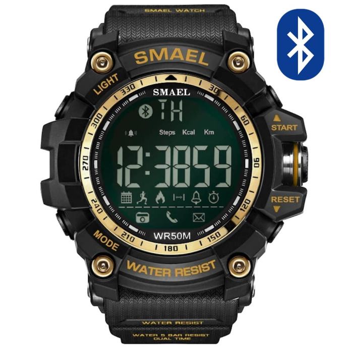 Pametna ura Smael S-shock GG1000-Bluetooth je na pogled identične kot moške ure priznane blagovne znamke, a je veliko cenejša. Ta športna ura se lahko preko Bluetooth povezave poveže z vašim pametnim mobilnim telefonom in vam ponuja kar 15 funkcij. Bluetooth 4.0 deluje tako na iOS (7.0 ali novejši) kot tudi Android (4.3 ali novejši) operacijskih sistemih.Ponuja vam vse, kar vam lahko ponudijo dražje pametne ure.Na voljo so vam številne napredne funkcije, kot so: Merjenje korakov, merjenje razdalje, merjenje porabljenih kalorij, opozorila za klice, opozorila za sporočila, opozorila drugih aplikacij (Facebook, Twitter, Skyp, WhatApp, ipd.), oddaljeno slikanje, digitalni prikaz časa, prikaz datuma in dneva v tednu, časovni alarm, štoparica, lučka in še bi lahko naštevali.Dodatna prednost pametne ure Smael S-shock GG1000-Bluetooth je ta, da je ni treba vsakodnevno polniti. Pametna ura ima namreč vgrajeno veliko baterijo (CR2450) japonske blagovne znamke Maxell. To pa pomeni, dolgo življensko dobo baterije, ki v stanju pripravljenosti zdrži do dve leti. Seveda pa je življenska doba baterije odvisna od samega načina uporabe ure.Ura ima oznako vodotesnosti 50 metrov (5 ATM), kar pomeni, da se z uro lahko tudi tuširate.Pametna ura S-shock GG1000-Bluetooth je prava izbira za vse, ki jim običajne ročne ure niso dovolj. Če od ročne ure zahtevate več, a niste pripravljeni odšteti enormnih zneskov, ste našli pravo. Z ročno uro S-shock GG1000-Bluetooth boste marsikoga preslepili, da bo mislil, da nosite precej dražjo ročno uro, ker sta si tako zelo podobni. Je res top model prave, robustne moške ure. Prepričajte se sami, ne boste razočarani!V kolikor z nakupom niste zadovoljni, lahko ročno uro v roku 60-ih dni od prejema vrnete na naš naslov. Mi pa vam bomo vrnili kupnino.Ročna ura ima 12 mesecev garancije.