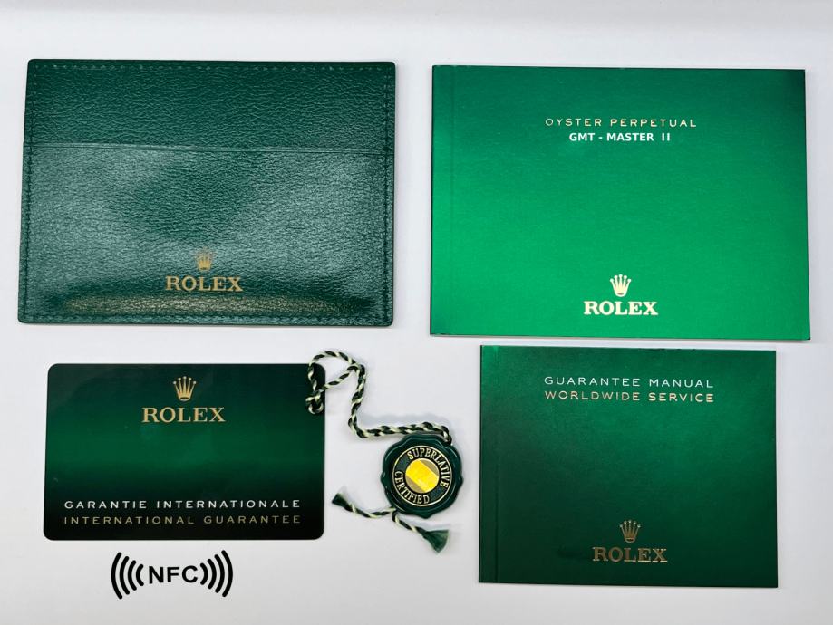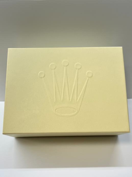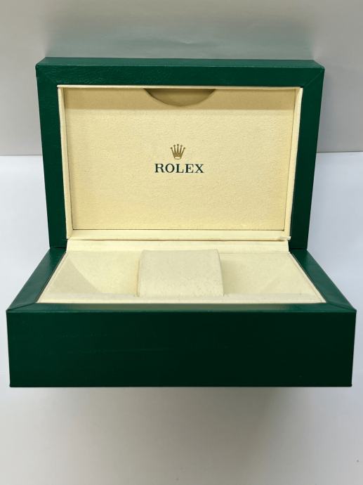 Ura ima edinstven garancijski list z ustrezno serijsko številko in funkcijo NFC (po skeniranju kartice vas bo preusmerila na spletno stran Rolex), torbico, zunanjo zaščitno škatlo, leseno škatlo, ustrezne originalne dokumente, hologramski obesek in usnjeno držalo za dokumente.**