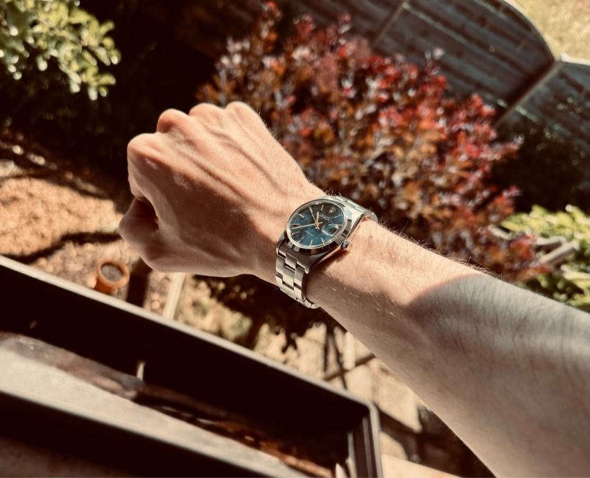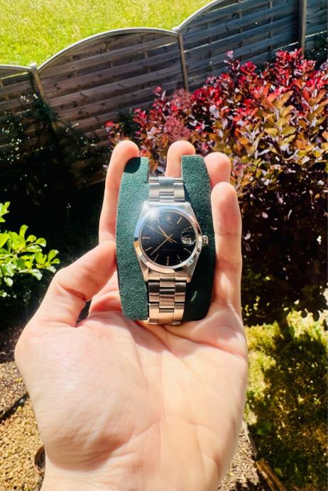 Prodam izjemno lepo ohranjeno uro Rolex Oysterdate Precision (ref. 6694) iz 70. let. Redka črna številčnica s pozlačenimi kazalci in 34 mm jeklenim Oyster ohišjem. Ročni mehanizem Rolex 1225 deluje brezhibno – v marcu 2025 je bil opravljen celostni servis pri Robniku, zraven priložim tudi potrdilo o avtentičnosti.
