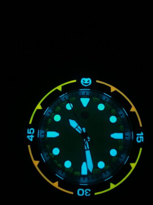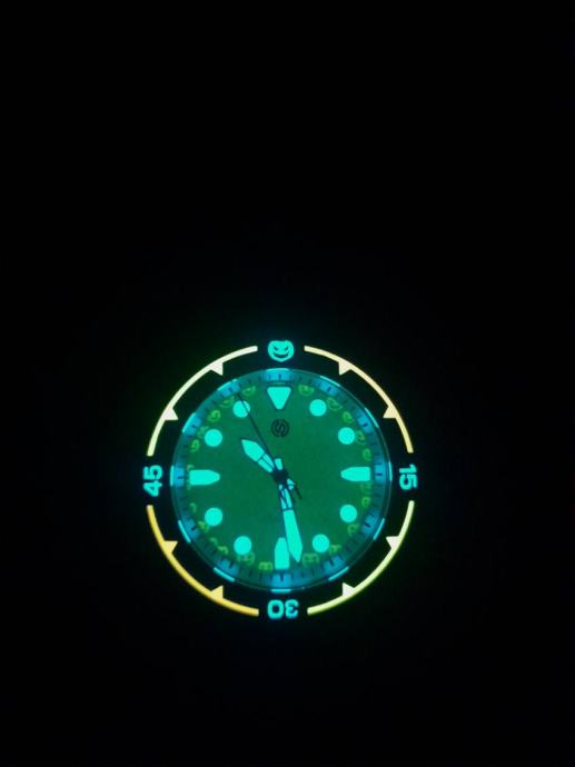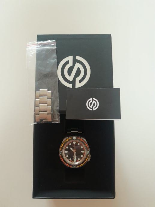 Microbrand Signum. Uro poganja Seiko nh38 mehanizem. Safirno steklo, diver ura 200m. Ura ima manjšo prasko na zaponki - vidno na sliki. Halloween limited edition - 100 kosov.