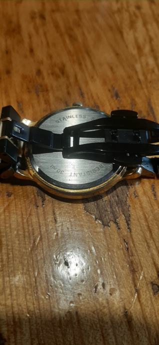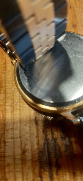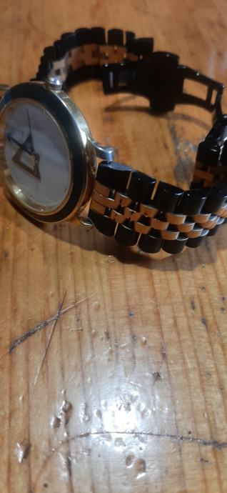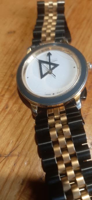 Prodajam rabljeno moško ročno uro znamke Urca s švicarskim kvarčnim mehanizmom. Ura ima eleganten dizajn z dvobarvno zapestnico (črno-zlata) in unikatno številčnico z geometrijskim vzorcem. Je v dobrem stanju in predstavlja odlično izbiro za ljubitelje kakovostnih ur.