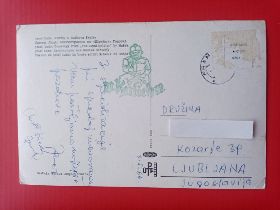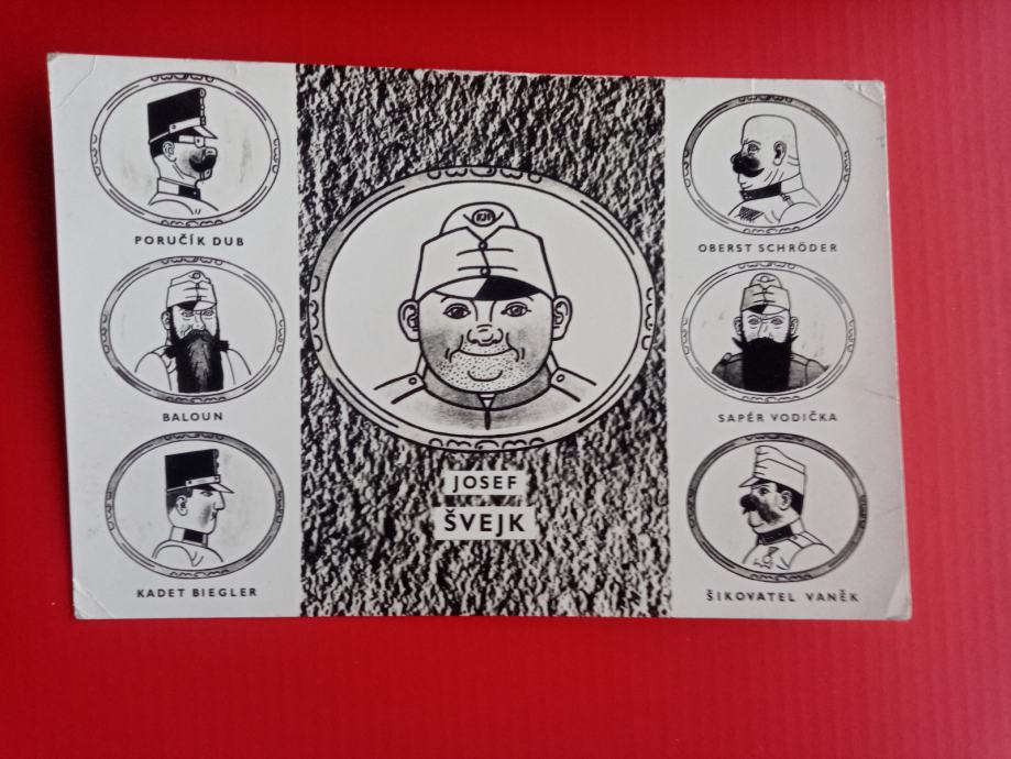 Črno-bela ilustrirana razglednica z glavnimi liki iz satiričnega romana o vojaku Švejku, narisana v prepoznavnem slogu Josefa Lade, pošiljana iz Prage v Ljubljano.