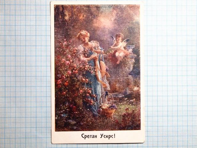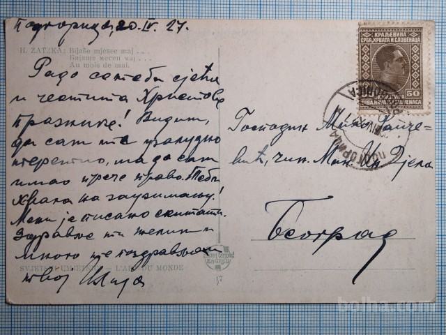 Razglednica SREČEN BOŽIČ, potovala 1927, z znamko.