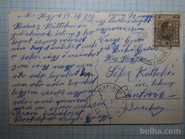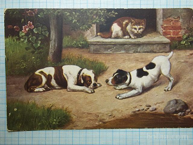 Razglednica SLIKARSTVO - mačka in psičkana dvorišču, potovala 1928.